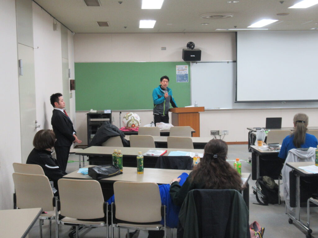午後からの研修会となり、前半は座学「電動車椅子サッカーを取り巻く状況、重度肢体不自由者へのスポーツ導入」で約80分講義を、後半は実技講習「電動車椅子サッカー」で約120分体験会を実施しました。