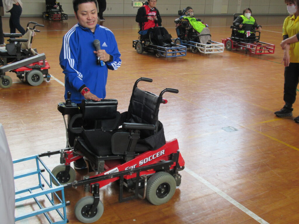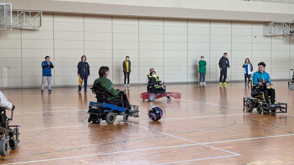 参加した指導員からは、座学は電動車椅子サッカーを含め、障がい者サッカーの種類や対象者について知ることができ、現状の課題等を考える良い機会になったとの話がありました。実技は、電動車椅子操作の指導を受け各々動かしてみましたが、中々思うように操作ができませんでした。後半はグループに分かれミニゲームを行いました。